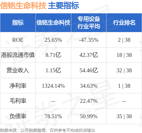 信铭生命科技港股市值8.71亿港元,在专用设备行业中排名第18。主要指标见下表: