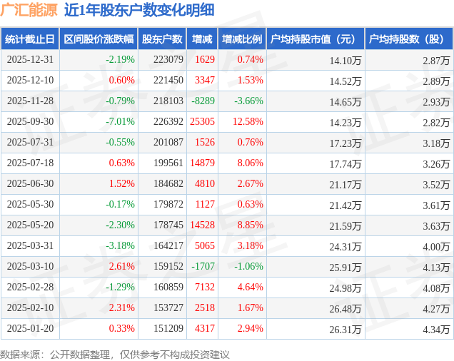 从股价来看,2025年12月10日至2025年12月31日,广汇能源区间跌幅为2.19%,在此期间股东户数增加1629.0户,增幅为0.74%。