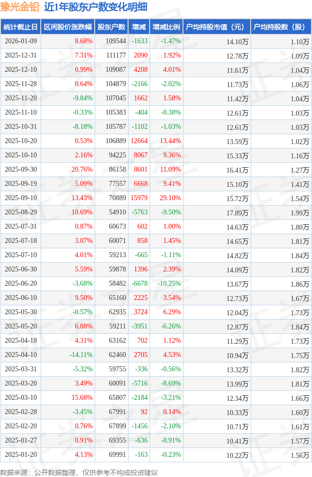 从股价来看,2025年12月31日至2026年1月9日,豫光金铅区间涨幅为8.68%,在此期间股东户数减少1633.0户,减幅为1.47%。