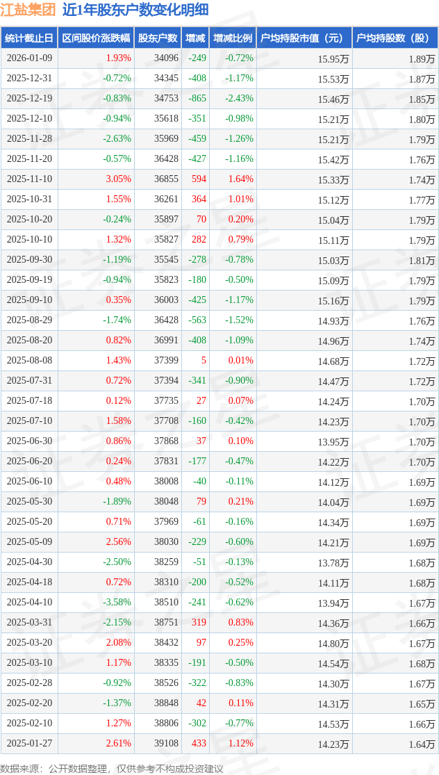 从股价来看,2025年12月31日至2026年1月9日,江盐集团区间涨幅为1.93%,在此期间股东户数减少249.0户,减幅为0.72%。