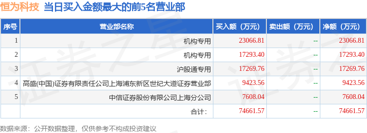 证券之星消息,沪深交易所2026年1月13日公布的交易公开信息显示,恒为科技(603496)因有价格涨跌幅限制的日换手率达到20%的前五只证券登上龙虎榜。此次是近5个交易日内第2次上榜。