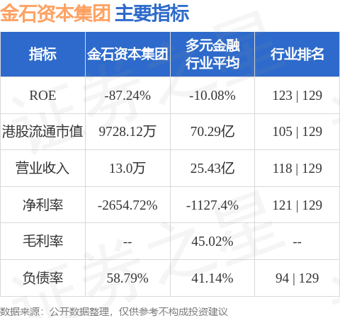 金石资本集团港股市值9728.12万港元,在多元金融行业中排名第105。主要指标见下表: