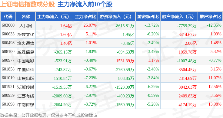 资金流向方面,上证电信(000040)指数成份股当日主力资金净流出合计61.4亿元,游资资金净流入合计15.69亿元,散户资金净流入合计45.7亿元。成份股资金流向详情见下表: