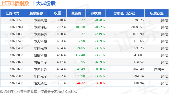 上证电信(000040)指数十大成份股详情如下: