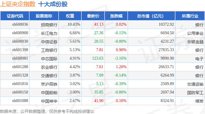 上证央企(000042)指数十大成份股详情如下: