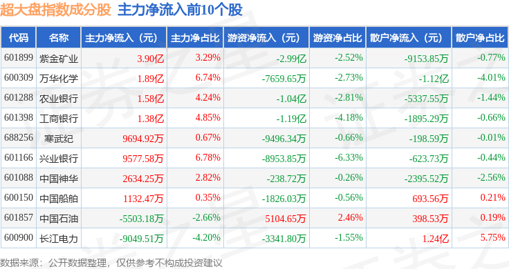 资金流向方面,超大盘(000043)指数成份股当日主力资金净流出合计41.04亿元,游资资金净流入合计18.63亿元,散户资金净流入合计22.41亿元。成份股资金流向详情见下表:
