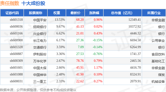 证券之星消息,1月13日,责任指数(000048)报收于1505.75点,涨0.15%,成交1066.23亿元,换手率1.06%。当日该指数成份股中,上涨的有39家,上海建工以10.14%的涨幅领涨,下跌的有56家,国科军工以12.32%的跌幅领跌。