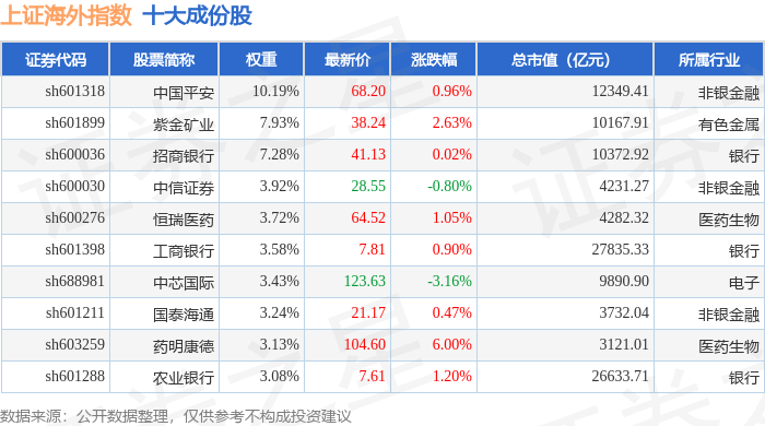 证券之星消息,1月13日,上证海外(000054)指数报收于1661.18点,涨0.68%,成交1418.43亿元,换手率0.42%。当日该指数成份股中,上涨的有38家,药明康德以6.0%的涨幅领涨,下跌的有26家,中国中免以3.66%的跌幅领跌。