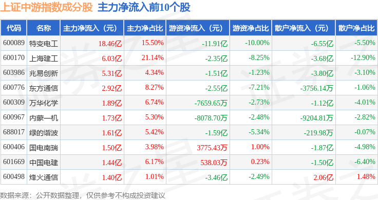 资金流向方面,上证中游(000095)指数成份股当日主力资金净流出合计255.09亿元,游资资金净流入合计82.52亿元,散户资金净流入合计172.56亿元。成份股资金流向详情见下表: