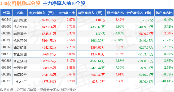 资金流向方面,380材料(000105)指数成份股当日主力资金净流出合计16.32亿元,游资资金净流入合计4.22亿元,散户资金净流入合计12.1亿元。成份股资金流向详情见下表: