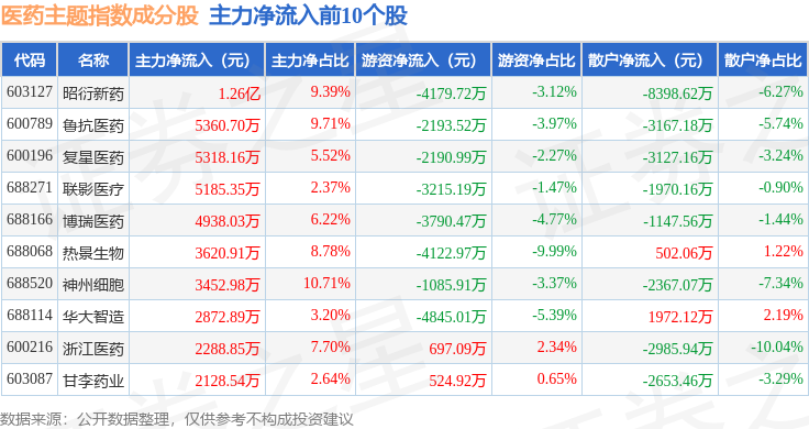 资金流向方面,医药主题(000121)指数成份股当日主力资金净流出合计4.08亿元,游资资金净流入合计2336.88万元,散户资金净流入合计3.85亿元。成份股资金流向详情见下表: