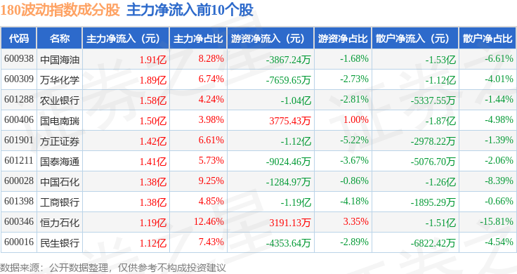 资金流向方面,180波动(000129)指数成份股当日主力资金净流出合计16.41亿元,游资资金净流入合计3.33亿元,散户资金净流入合计13.07亿元。成份股资金流向详情见下表: