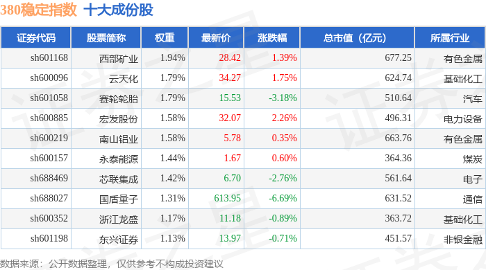 380稳定(000142)指数十大成份股详情如下: