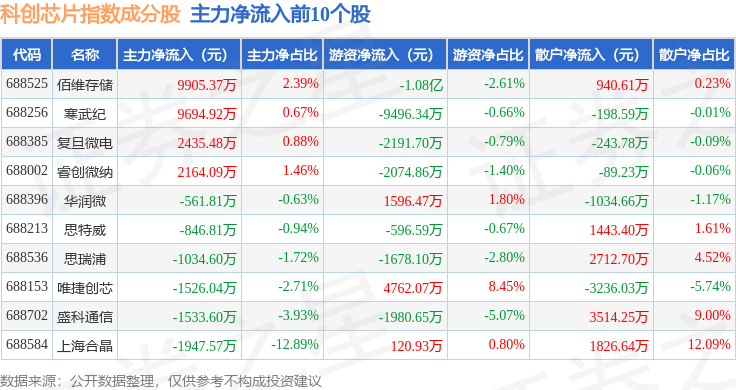 资金流向方面,科创芯片(000685)指数成份股当日主力资金净流出合计80.02亿元,游资资金净流入合计45.58亿元,散户资金净流入合计34.44亿元。成份股资金流向详情见下表: