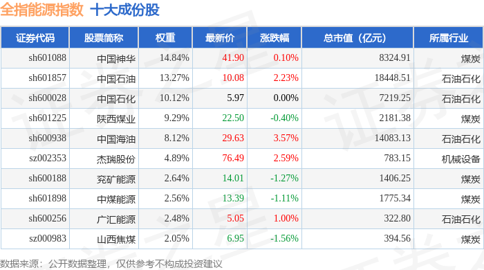 证券之星消息,1月13日,全指能源(000986)指数报收于2404.11点,涨0.58%,成交256.96亿元,换手率0.83%。当日该指数成份股中,上涨的有20家,中海油服以6.03%的涨幅领涨,下跌的有25家,宝泰隆以3.11%的跌幅领跌。