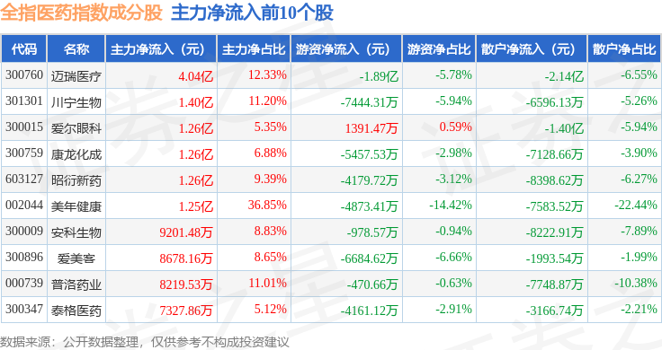 资金流向方面,全指医药(000991)指数成份股当日主力资金净流入合计8.97亿元,游资资金净流出合计4.22亿元,散户资金净流出合计4.47亿元。成份股资金流向详情见下表: