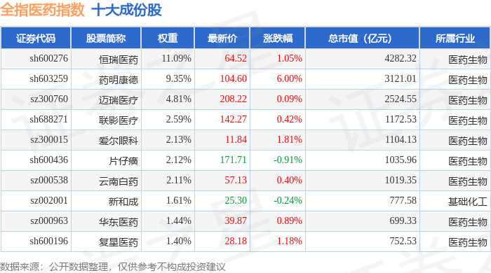 全指医药(000991)指数十大成份股详情如下: