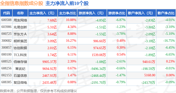 资金流向方面,全指信息(000993)指数成份股当日主力资金净流出合计369.32亿元,游资资金净流入合计130.21亿元,散户资金净流入合计239.11亿元。成份股资金流向详情见下表: