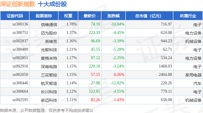 证券之星消息,1月13日,深证创新(399016)指数报收于6227.01点,跌2.68%,成交2837.08亿元,换手率4.5%。当日该指数成份股中,上涨的有21家,许继电气以4.54%的涨幅领涨,下跌的有78家,华测导航以12.14%的跌幅领跌。