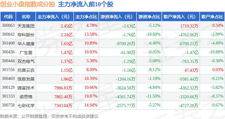 资金流向方面,创业小盘(399020)指数成份股当日主力资金净流出合计82.18亿元,游资资金净流入合计6.72亿元,散户资金净流入合计75.45亿元。成份股资金流向详情见下表: