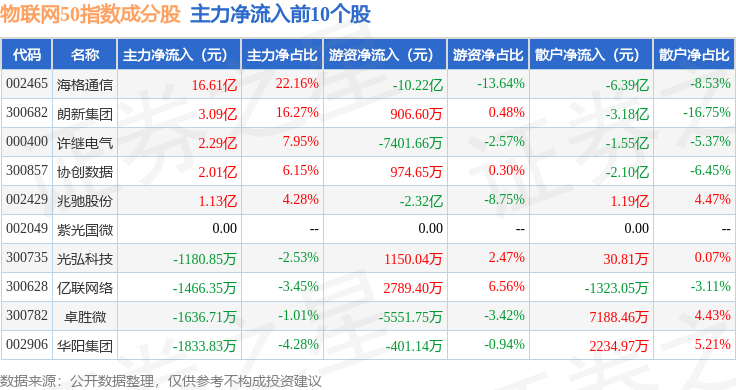 资金流向方面,物联网50(399285)指数成份股当日主力资金净流出合计101.69亿元,游资资金净流入合计28.77亿元,散户资金净流入合计72.92亿元。成份股资金流向详情见下表: