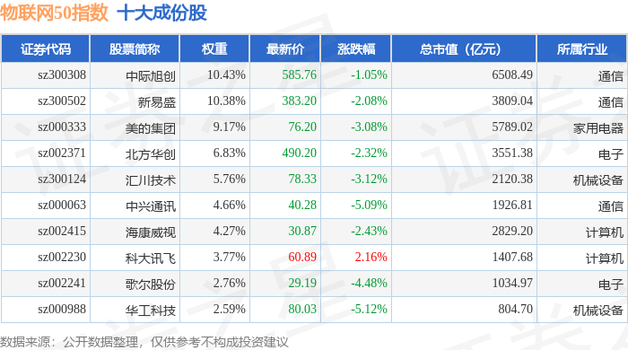 物联网50(399285)指数十大成份股详情如下:
