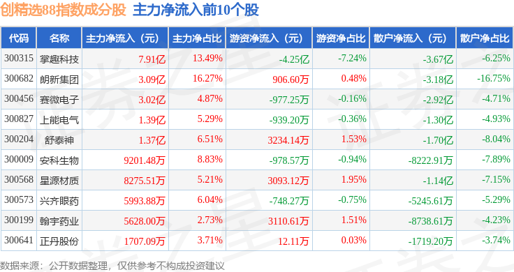 资金流向方面,创精选88(399291)指数成份股当日主力资金净流出合计82.53亿元,游资资金净流入合计19.22亿元,散户资金净流入合计63.31亿元。成份股资金流向详情见下表: