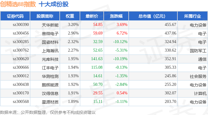 创精选88(399291)指数十大成份股详情如下: