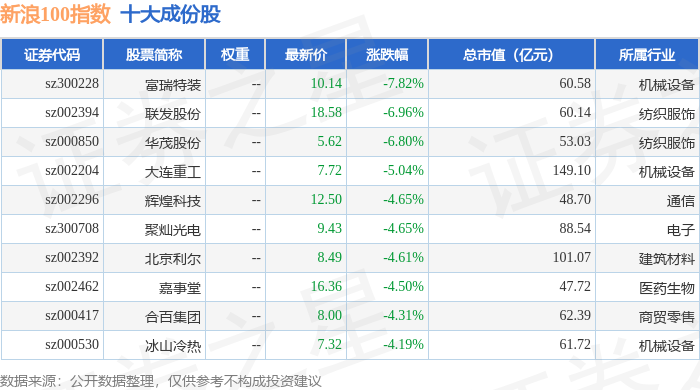 资金流向方面,新浪100(399297)指数成份股当日主力资金净流出合计17.28亿元,游资资金净流入合计3.97亿元,散户资金净流入合计13.3亿元。成份股资金流向详情见下表: