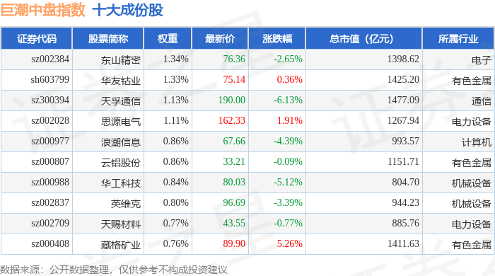巨潮中盘(399315)指数十大成份股详情如下: