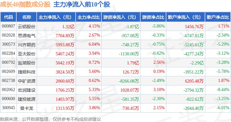 资金流向方面,成长40(399326)指数成份股当日主力资金净流出合计59.39亿元,游资资金净流入合计14.51亿元,散户资金净流入合计44.88亿元。成份股资金流向详情见下表: