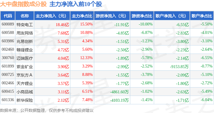 资金流向方面,大中盘(399400)指数成份股当日主力资金净流出合计606.88亿元,游资资金净流入合计176.73亿元,散户资金净流入合计430.43亿元。成份股资金流向详情见下表: