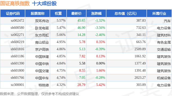 证券之星消息,1月13日,国证高铁(399419)指数报收于2246.84点,跌0.86%,成交333.04亿元,换手率1.36%。当日该指数成份股中,上涨的有12家,雷尔伟以5.93%的涨幅领涨,下跌的有36家,国睿科技以9.59%的跌幅领跌。