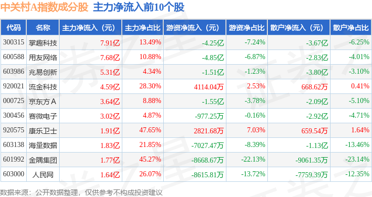 资金流向方面,中关村A(399422)指数成份股当日主力资金净流出合计200.59亿元,游资资金净流入合计48.06亿元,散户资金净流入合计157.46亿元。成份股资金流向详情见下表: