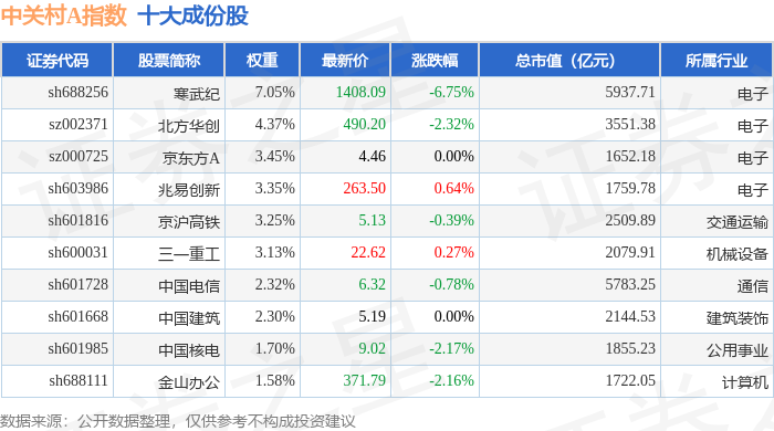 中关村A(399422)指数十大成份股详情如下: