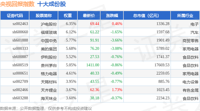 央视回报(399553)指数十大成份股详情如下: