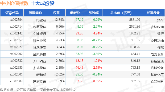 证券之星消息,1月13日,中小价值(399604)指数报收于2129.65点,跌0.22%,成交911.48亿元,换手率1.98%。当日该指数成份股中,上涨的有37家,兆驰股份以5.42%的涨幅领涨,下跌的有57家,奥海科技以5.42%的跌幅领跌。