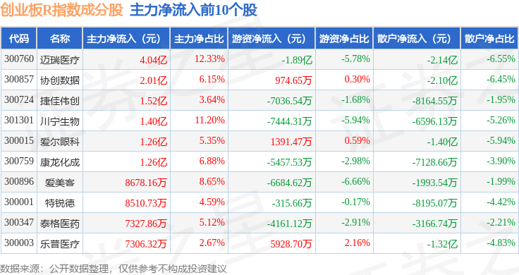 资金流向方面,创业板R(399606)指数成份股当日主力资金净流出合计247.03亿元,游资资金净流入合计83.6亿元,散户资金净流入合计163.43亿元。成份股资金流向详情见下表: