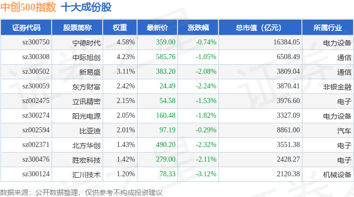 中创500(399625)指数十大成份股详情如下: