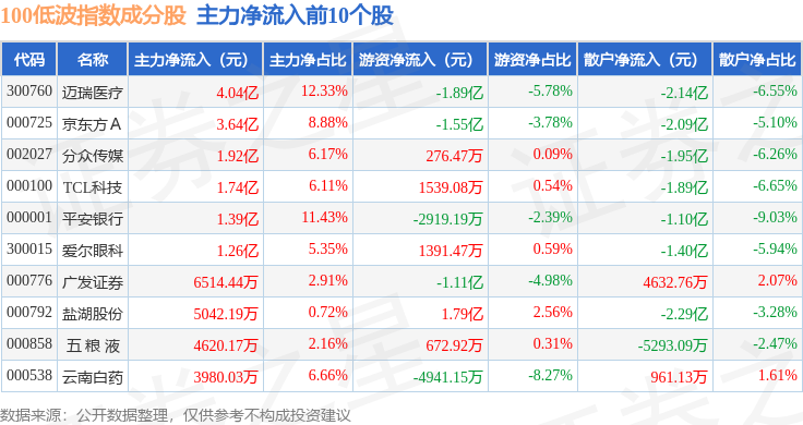 资金流向方面,100低波(399645)指数成份股当日主力资金净流出合计19.53亿元,游资资金净流入合计3.56亿元,散户资金净流入合计15.97亿元。成份股资金流向详情见下表: