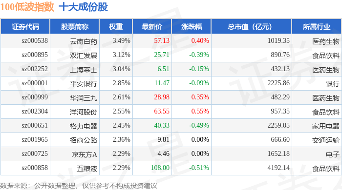 100低波(399645)指数十大成份股详情如下: