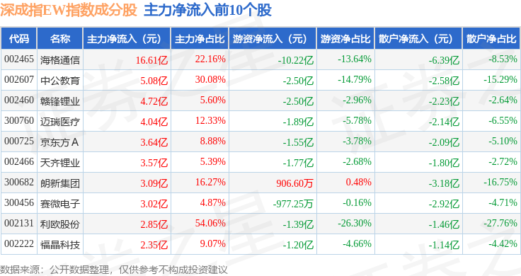 资金流向方面,深成指EW(399659)指数成份股当日主力资金净流出合计581.7亿元,游资资金净流入合计140.17亿元,散户资金净流入合计441.53亿元。成份股资金流向详情见下表: