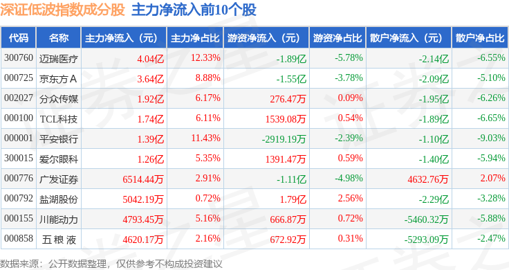 资金流向方面,深证低波(399661)指数成份股当日主力资金净流出合计24.97亿元,游资资金净流入合计3.23亿元,散户资金净流入合计21.73亿元。成份股资金流向详情见下表: