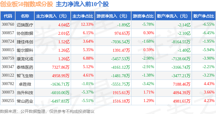 资金流向方面,创业板50(399673)指数成份股当日主力资金净流出合计224.52亿元,游资资金净流入合计76.8亿元,散户资金净流入合计147.71亿元。成份股资金流向详情见下表: