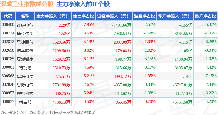 资金流向方面,深成工业(399682)指数成份股当日主力资金净流出合计158.37亿元,游资资金净流入合计33.8亿元,散户资金净流入合计124.56亿元。成份股资金流向详情见下表: