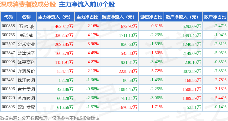资金流向方面,深成消费(399684)指数成份股当日主力资金净流出合计8.89亿元,游资资金净流入合计2.97亿元,散户资金净流入合计5.93亿元。成份股资金流向详情见下表: