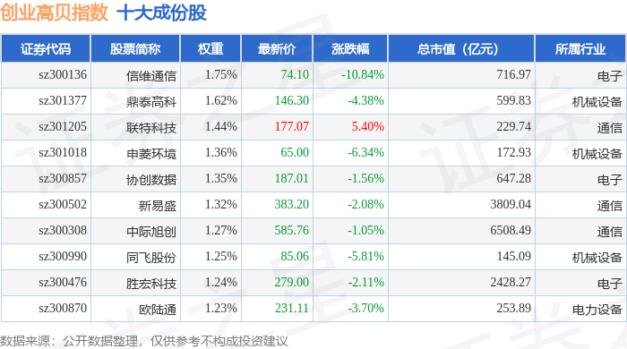 证券之星消息,1月13日,创业高贝(399694)指数报收于4798.09点,跌3.21%,成交3189.22亿元,换手率9.7%。当日该指数成份股中,上涨的有12家,赛微电子以6.72%的涨幅领涨,下跌的有88家,信维通信以10.84%的跌幅领跌。