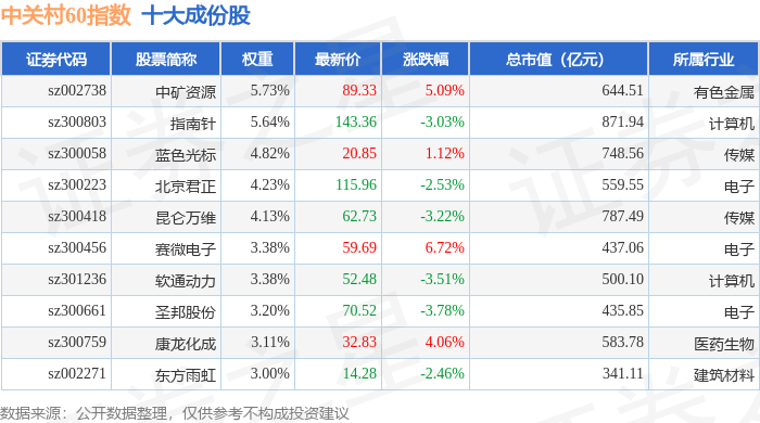 中关村60(399697)指数十大成份股详情如下: