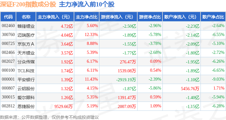 资金流向方面,深证F200(399703)指数成份股当日主力资金净流出合计232.0亿元,游资资金净流入合计56.8亿元,散户资金净流入合计175.2亿元。成份股资金流向详情见下表: