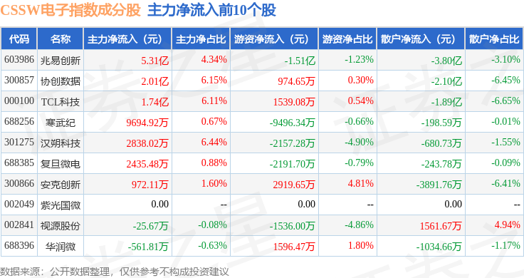 资金流向方面,CSSW电子(399811)指数成份股当日主力资金净流出合计169.27亿元,游资资金净流入合计63.24亿元,散户资金净流入合计106.04亿元。成份股资金流向详情见下表: